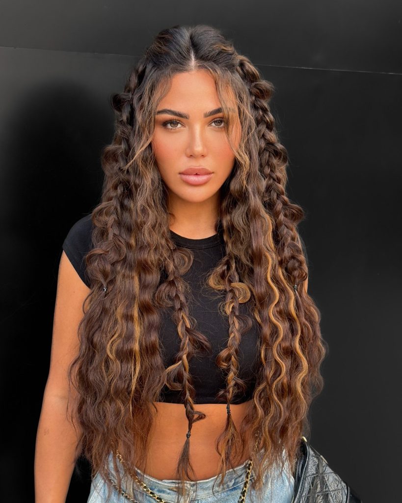 This hairstyle is a contrasting mixture of a huge curly ponytail attached with side braids. The braids are the main part and the decorative detail which makes the head more interesting. At the same time, the curls run down for an eye-catching and vivid style. It is this style is advisable for people having medium-long hair try it out in a fun, but at the same time, the protective way. The difference between the separate braids and the certainly free curls makes it a perfect style for parties or a night out.