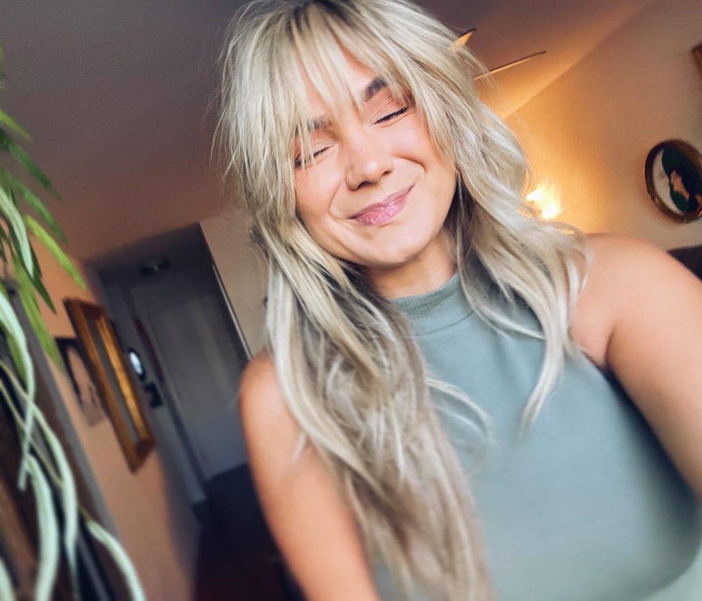 Those who have a round face and want a bit of an edge really can benefit from this long shaggy style with bangs. This look inspired by 90s grunge and indie goth fashion includes long layers and textured bangs that casually fall over the forehead. The style brings side volume, creating a boho style and also visually a bit longer face shape. The hairstyle is adaptable, it can be adorned with retro jewelry for a different, personal look. It might be the best option for anyone seeking to try something different such as a brave and expressive fashion.