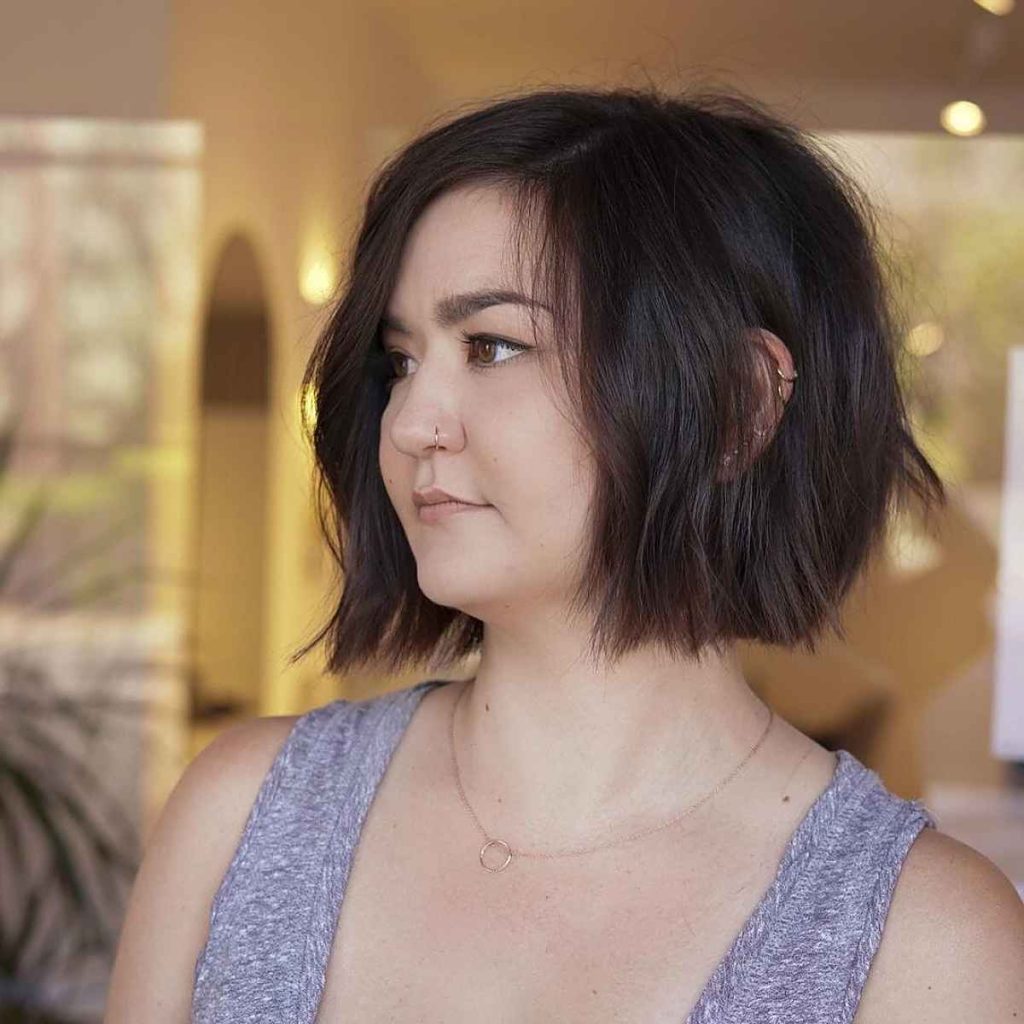 The mussed bob is a totally fashionable hairstyle for women with round faces who want a slight rebellious style. This haircut has short layers and a little bit of a textured effect that creates a relaxed and comfortable look. The tousled look gives it a fuller style and some dimension, which is ideal for women with a short thick hair texture who want a lighter hair without too much length. It’s an excellent haircut for ladies who prefer getting a trendy cut in a quick and stylish way and doesn’t require too much maintenance, therefore, it’s one of the best choices for simple, daily wear.