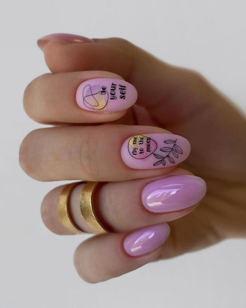 If you are a poet or a lover, wearing these long, almond-shaped soft pink nails is the best way to express your inner self. “Love yourself” and “Go to the Moon”, for instance, with these two phrases, each nail is a motivational speaker beside it. The style is not merely for its cuteness; it is also for the expressionist to inspire people to wear it like this.