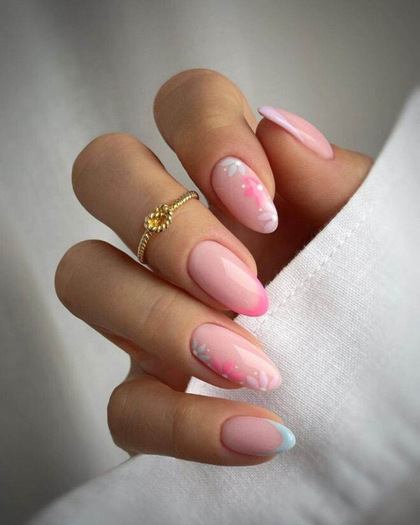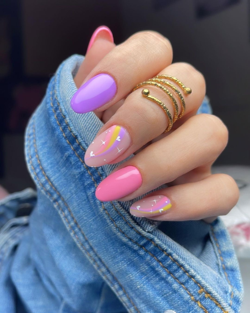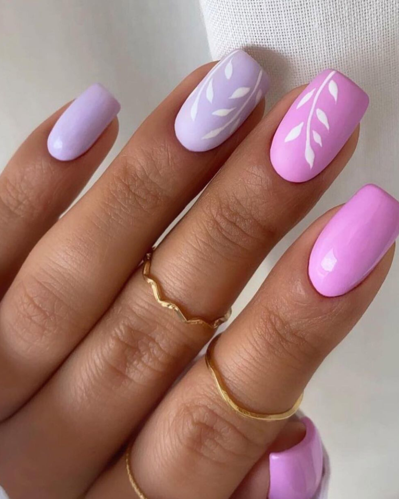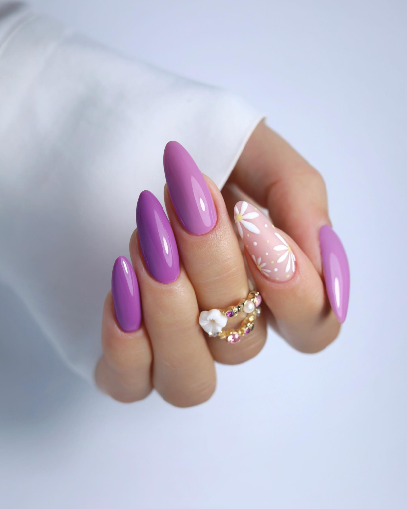 These long, almond-shaped nails are brought into the limelight with the help of the elegance they daunt, and the regal vibe they exude, and are completely covered in a lovely purple color. The white floral artistry that is added to a pink base and accentuated in one finger is a cute and artistic contrast. This design, which combines a traditional color with modernity, is suitable for both day and night occasions and is an excellent source of creativity for the entire summer season.