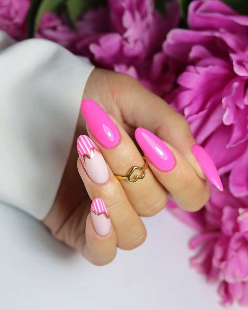 These nails are very long, almond-shaped with bold and neon outlines on a neutral pink and cream base that are the no.1 choice for a daring personality. They are the perfect piece of decor to catch attention during your summer vacation. The combination is an echo of the brights of the color trends for 2024, both the past and the present.