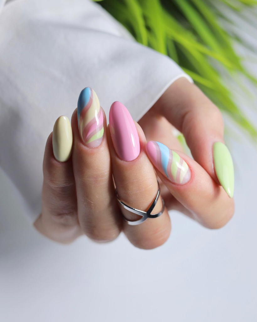 This candy-themed design that is pink, blue, and cream colors is mixed together in a way that reminds of your favorite summer desserts. The long almond shape of playful stripes creates a cute yet dynamic look, which resembles the whimsical and fun side of summer outfits.