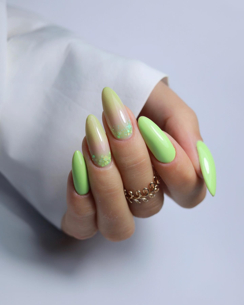 These long nails, as opposed to the green trend, are a fun, playful development. Their base is a pastel lemon-lime shade that evolves into a glittering ombre. In addition, it is a bright, fresh design that gives your summer wardrobe a new twist. This couple of nails,either with a normal dress or with a cocktail dress,will definitely make the outfit a little more feminine.