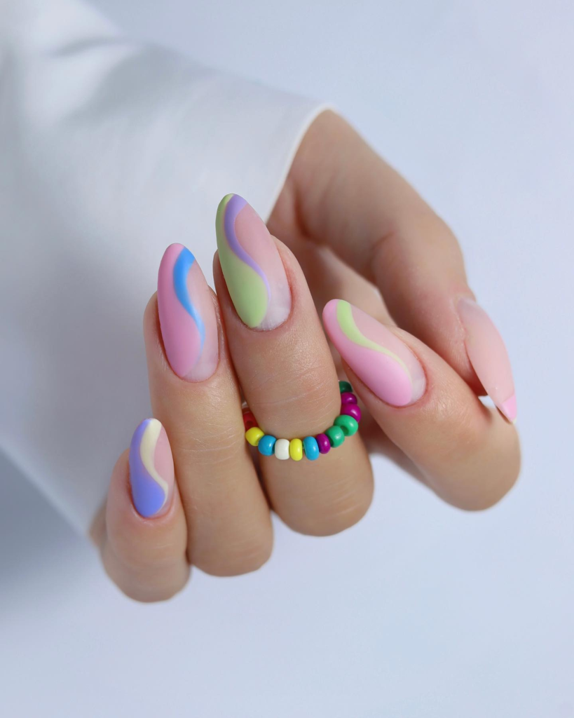 On these long almond-shaped nails, the soft undulating waves in pastel colors create a live feel of serene and relaxing summer fun. The three colors of blue, pink, and green are the accents of the nail art that pair with the whimsical side of the summer season. The design is a suggestion of a joyful summer filled with playful and airy experiences.