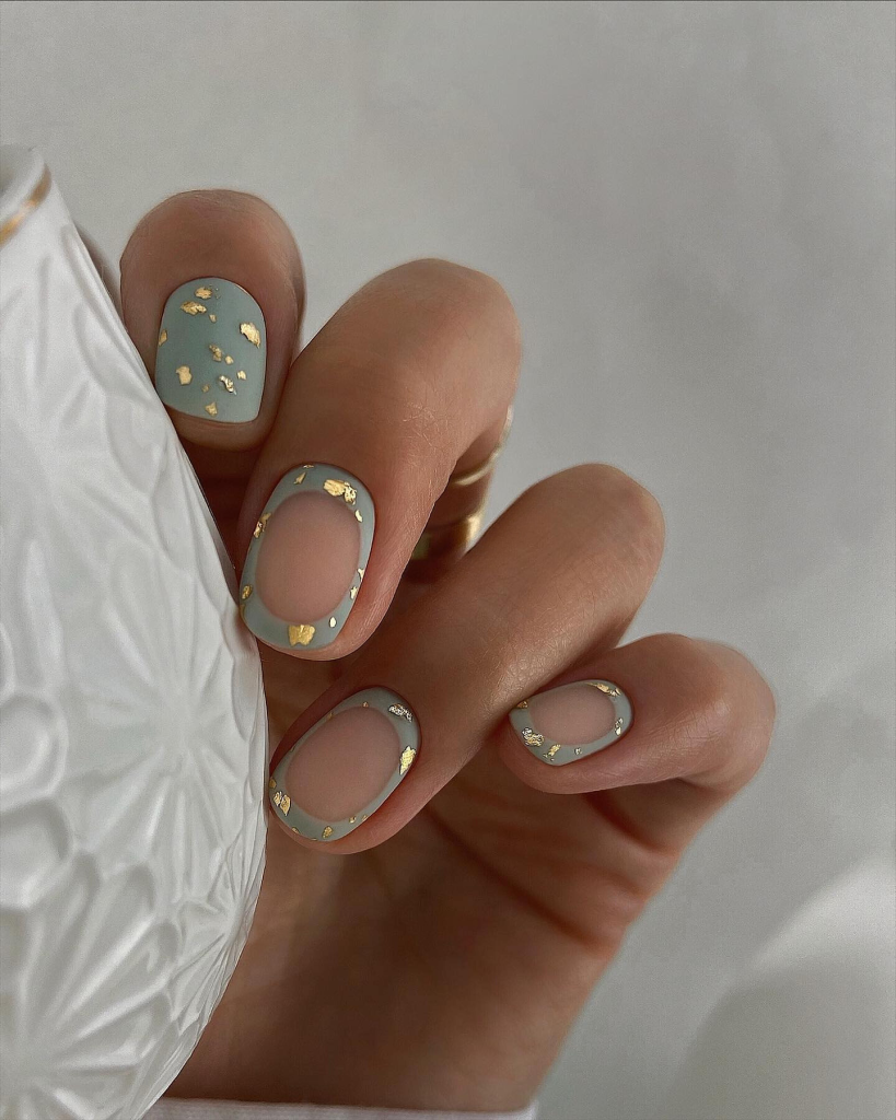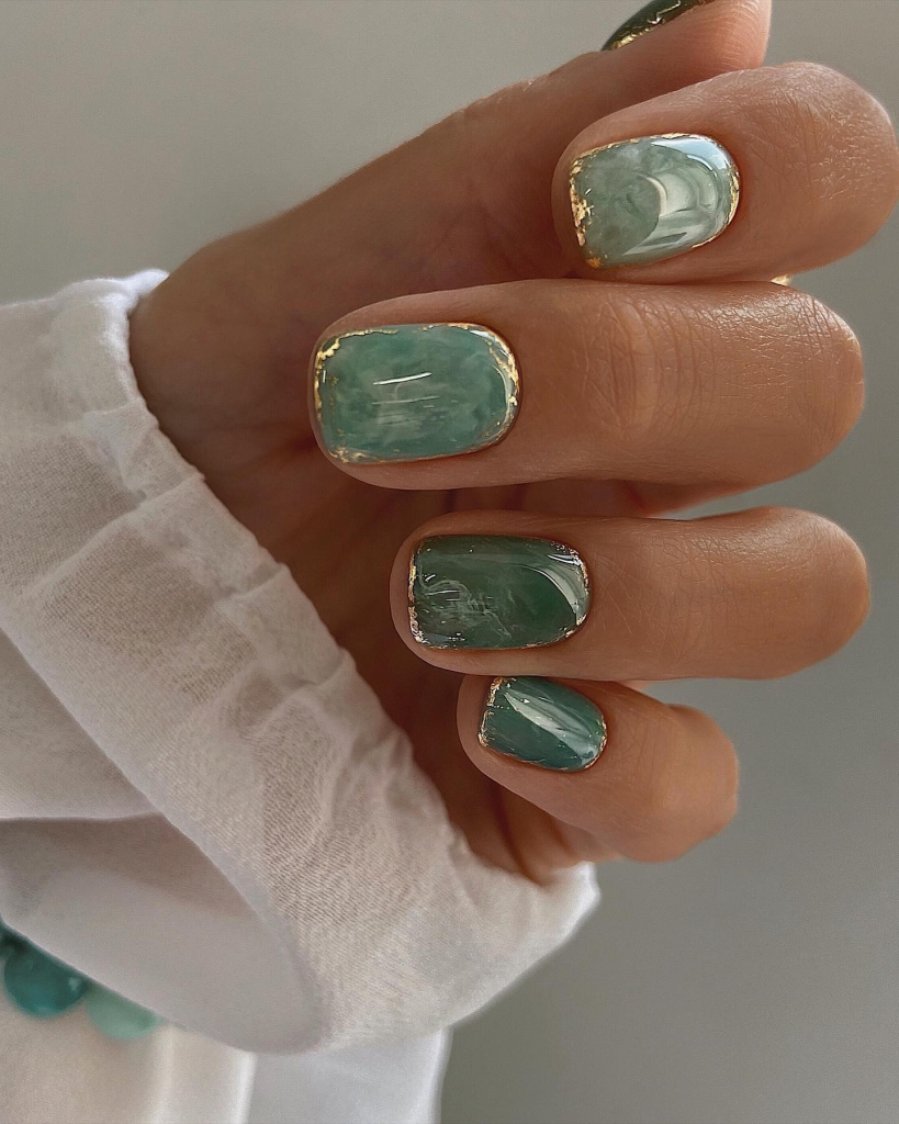 Minimalist short square nails become the epitome of luxurious opulence and sea peace at the same time. The seafoam green backdrop with golden leaf pieces resembles a beautiful relaxing beach. Wearing these nails with a sleeveless flowing maxi dress or a summer chic linen suit is a perfect choice for a high-end brunch or an evening summer party by the beach.