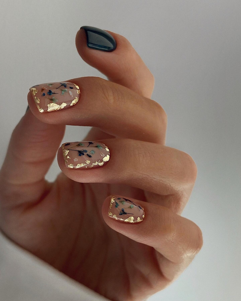 These short nails flaunt a lovely floral pattern over gold flakes which brings a hint of elegance in the Baroque style to them. The soft nude foundation is the most suitable canvas for the decorative gold and floral details, thus, combining classical beauty with modern nail art technology.