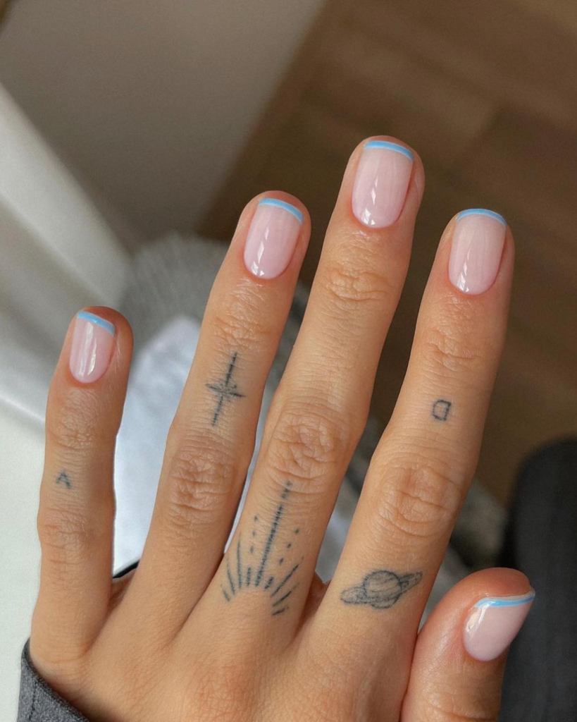 These super short square nails are indeed a real treasure for a fan of minimalist design. The light touch of sky blue at the edges brings an absolutely striking contrast with the nude base which reminds of the bright summer sky. This nail decoration would be a perfect match with any outfit and would be the best choice for people who like their style to be both plain and classy.