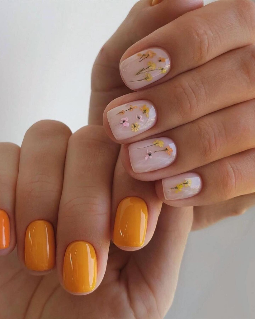 These nails embody the theme of summer with all its brightly colored vibes. Imperfect styles are with soft flowers depicted on the main color pastel pink while the other one is super extravagant in bright orange color. It is a contrast of gentle and striking, sweet and eye-catching, perfect for a person who loves to combine and thus attract attention.