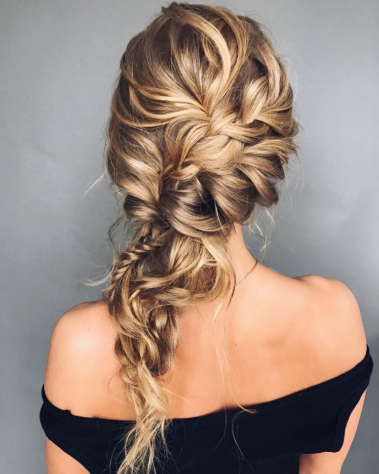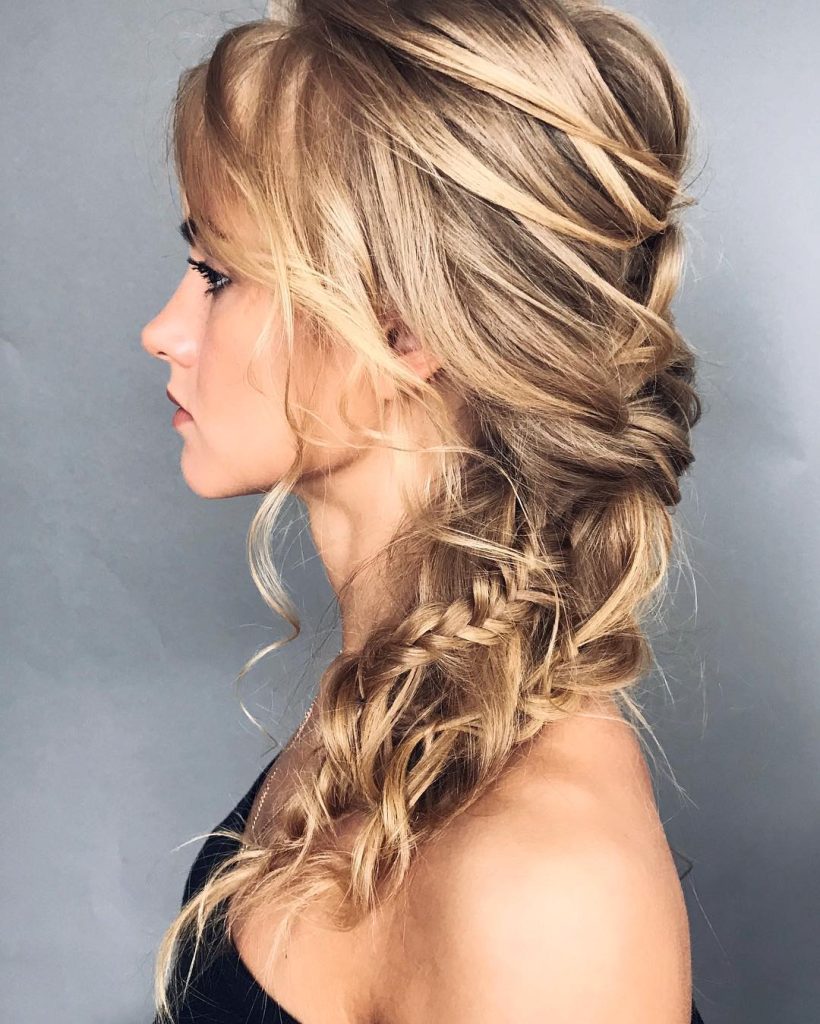 The chic and dreamy messy braid twist hairstyle is relaxed and defined by the strands that roll into a side braid that eats playfully with the overall beautiful design that seems almost effortless. Loose strands of hair on the face not only draw attention with their beauty but also add the style with some gentleness. This hairstyle is ideal for weddings and formal events and looks good with off-shoulder dresses.