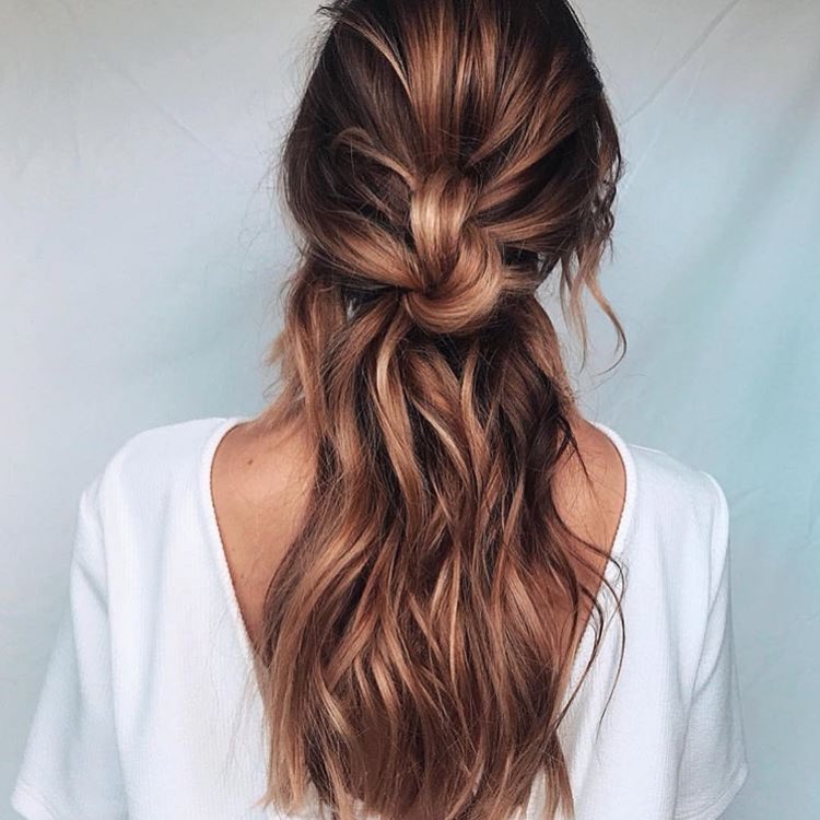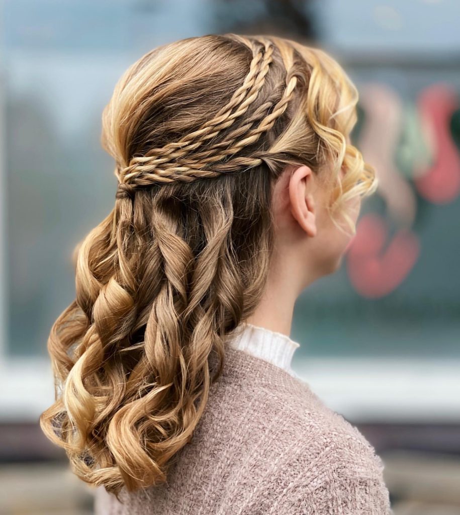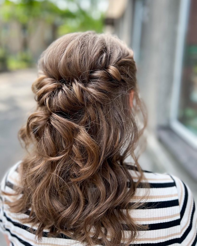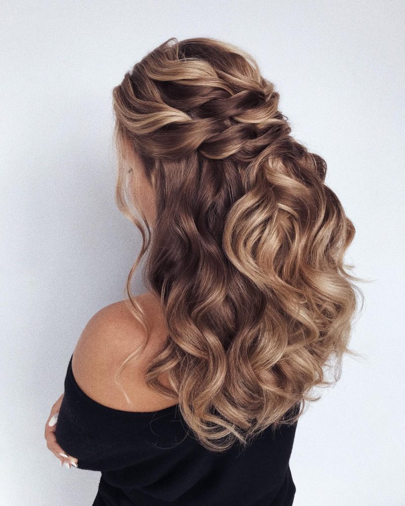 This gentle and sophisticated half-updo features the spell of intricately twisted strands flowing by into long, loose hair. The added dramatic curls are giving a gentle touch of glam, and so it becomes perfect for both weddings and date nights. Add some sparkling earrings to the outfit and you will get a 100% correct total look.