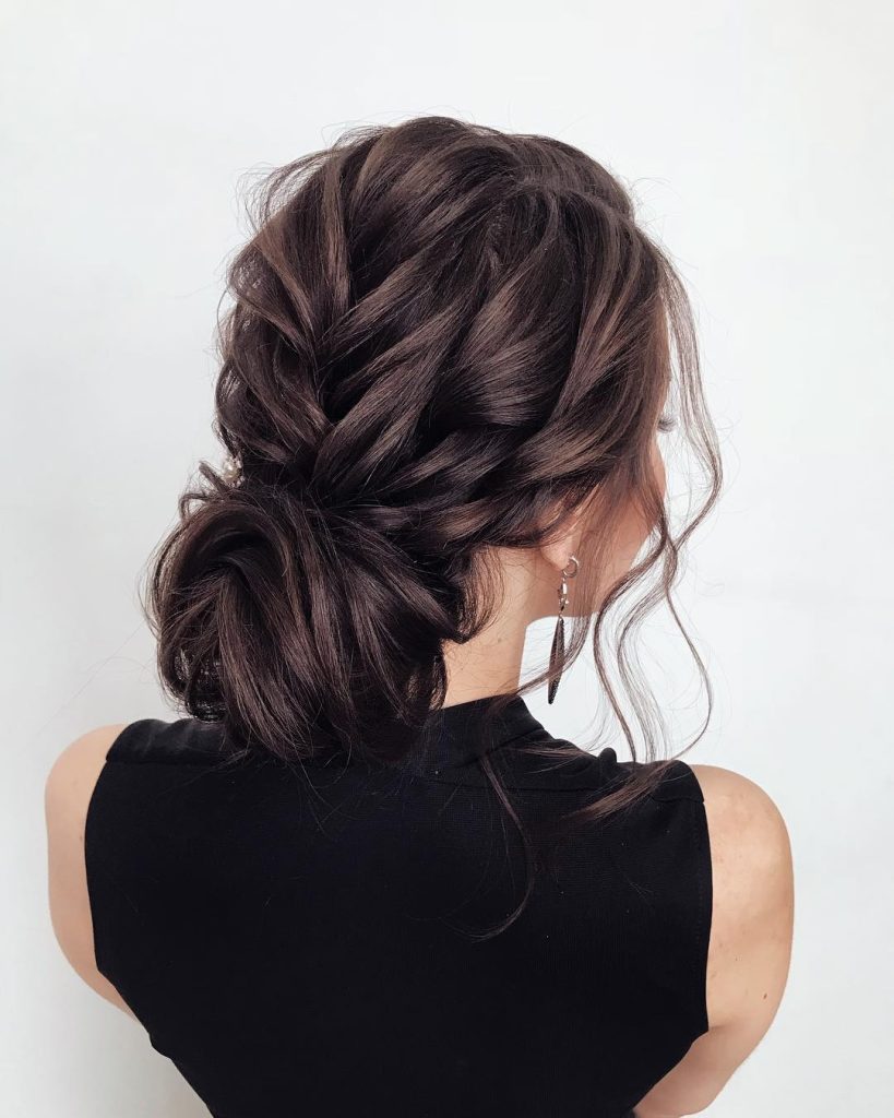 The low and intricate design of this hairstyle is remarkably beautiful. It is designed with delicately intertwined twists that lay a part into a fluffy and soft bun, which makes it a perfect fit for any corporate events. In addition, free hair strands on both sides of the face add more romantic and charming feelings to this hairdo. For a complete stylish outfit, you can match it with the stunning original earrings.