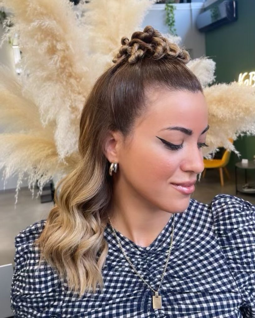 This half-bun clutter is the one with soft curls and the strands are laid free and wavy to give it a looser, elegant look. It is excellent for a casual outing or a brunch as it is both easy and stylish at the same time. Adorn the hairstyle with small ornaments for enhanced beauty.