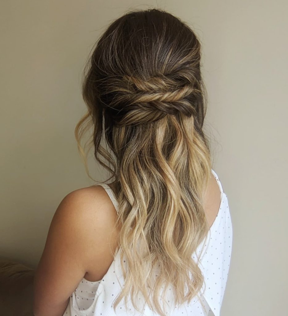 This twisted half-up is the combination of the chic and the beach wave which is so soft that it is an ideal option for casual hangouts or spring events. The free braid ends that are messy twisting are the ones that have turned the hair into a crown, making it look thick and beautiful, and they are too easily integrated in the long waves which are underneath them. To get that lively and carefree look and to make sure that the twists last all day, it is advisable to use a light-weight styling spray.