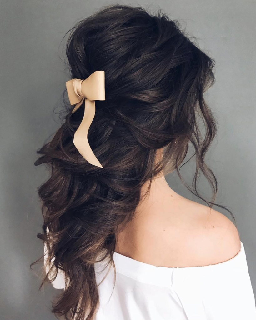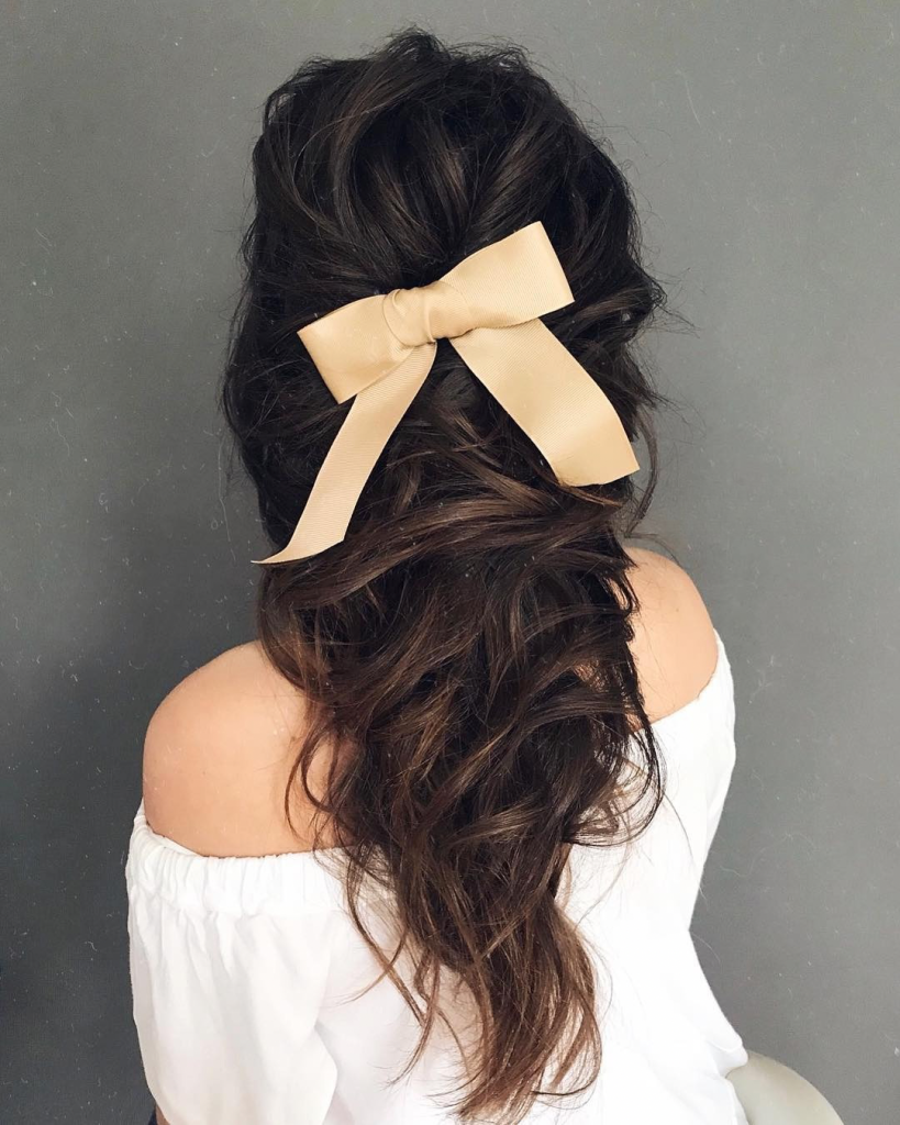 This special hairdo is a half-up design having a lot of volume with soft waves, and it is further embellished with a quirky bow as an accessory. The bow adds a feminine and playful element that makes it a perfect style for casual outings or spring picnics. Just wear a little jewelry to get the whole thing to the hair.