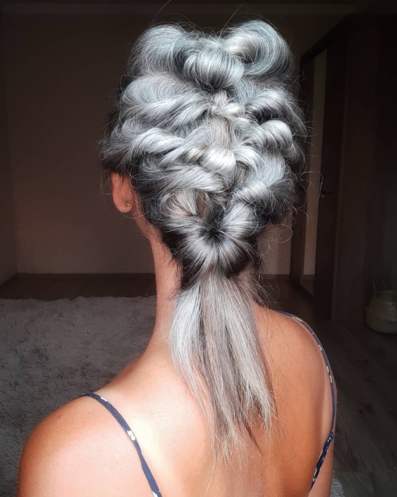 This complicated hairstyle with braids and twists is a charming way to display the glamour of silver hair. The layered arrangement adds some depth and dimension, which makes it an eye-catching choice for formal occasions. To achieve a perfect slick, make use of a light hairspray.