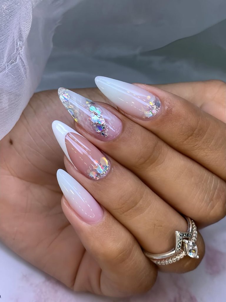 Something magical about these almond acrylic nails is the combination of soft ombré white and shiny iridescent spots. The transparent base sprinkled with reflective foil gives the light a catchiness reminiscent of icy and glamorous snow, freshly fallen on a cold winter morning. It is a dreamy version of the beauty of the seasons that automatically lifts even the simplest outfit.