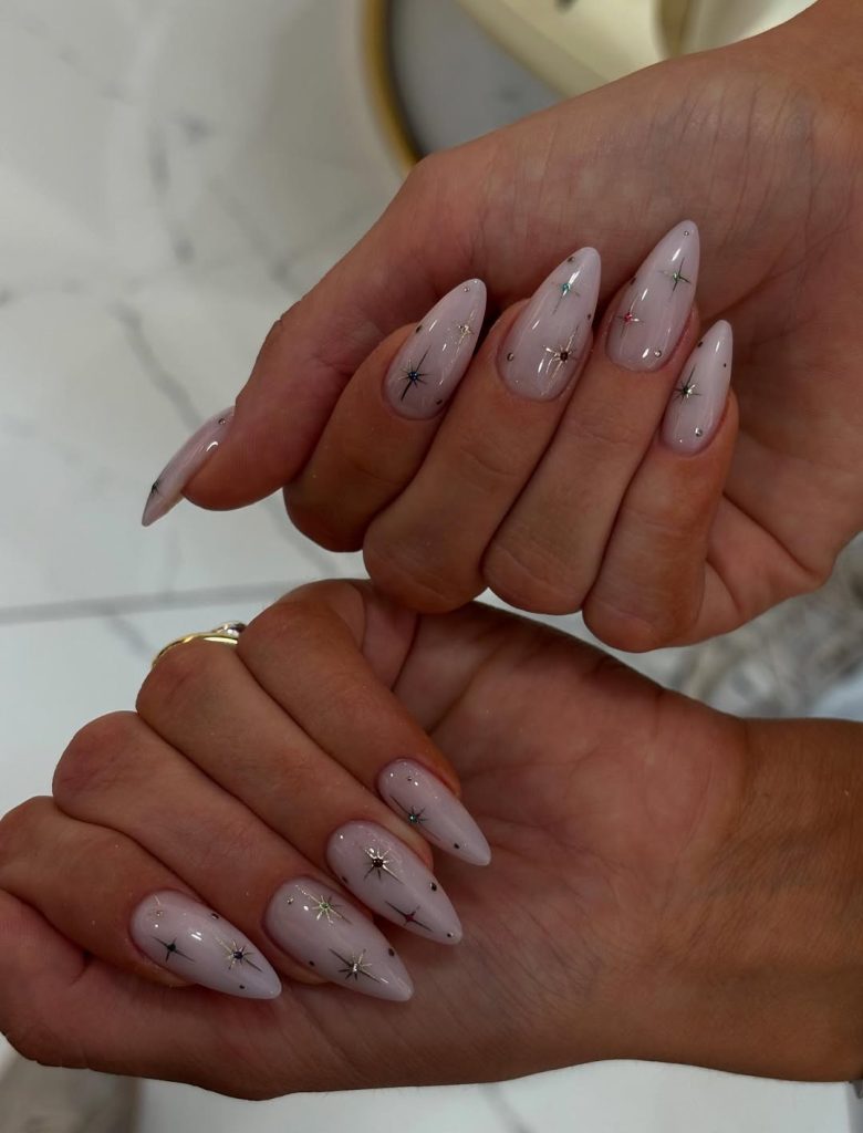 These nude almond nails are as dotted with dainty little star accents that are subtle yet mesmerizing, like a clear winter night sky. The dull base maintains the general appearance low key and classy with the metallic star art providing sparkles enough to attract attention. It is an understated, yet whispery design that women who love a subtle inspo will love.