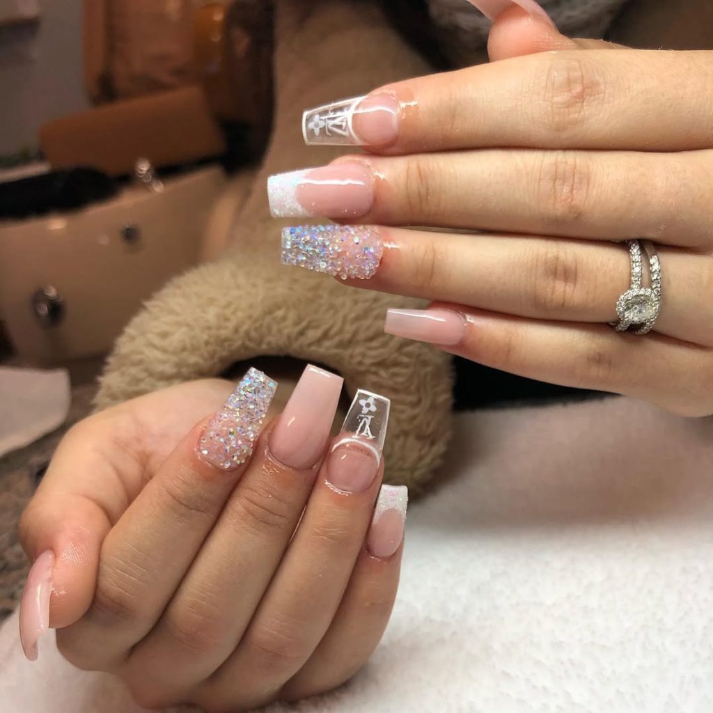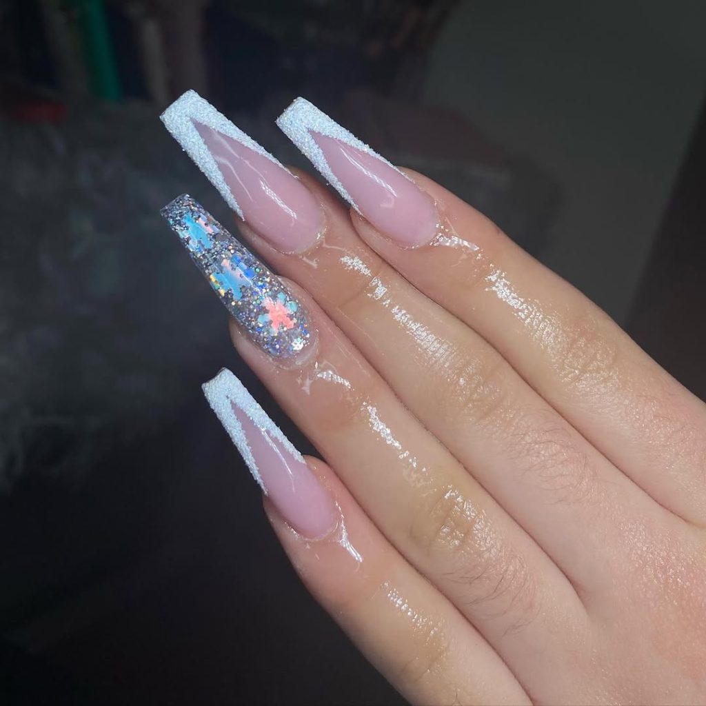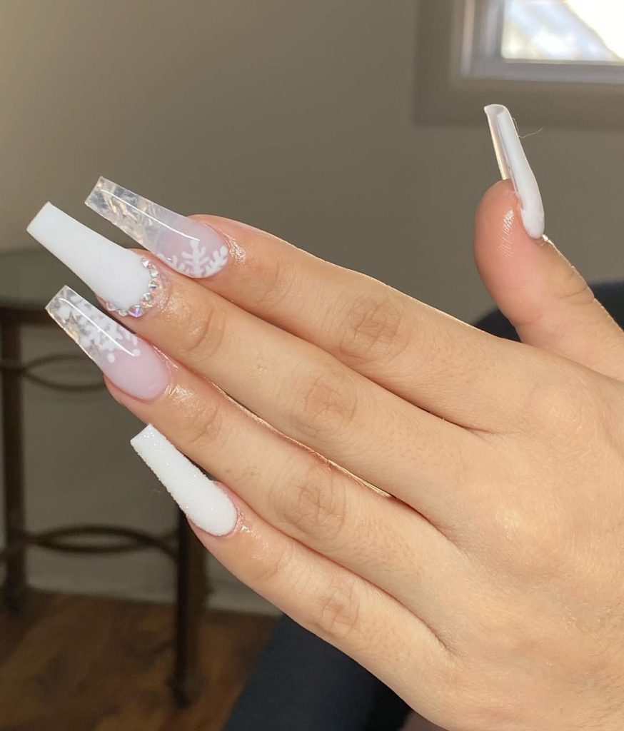 These coffin nails are glamour in themselves, with their sparkle of crystal detail and their frosty white ends. The combination of glitter, rhinestones, and faint winter patterns makes the appearance look modern, festive, and personality-filled. It is a kind of design that people comment on everywhere.