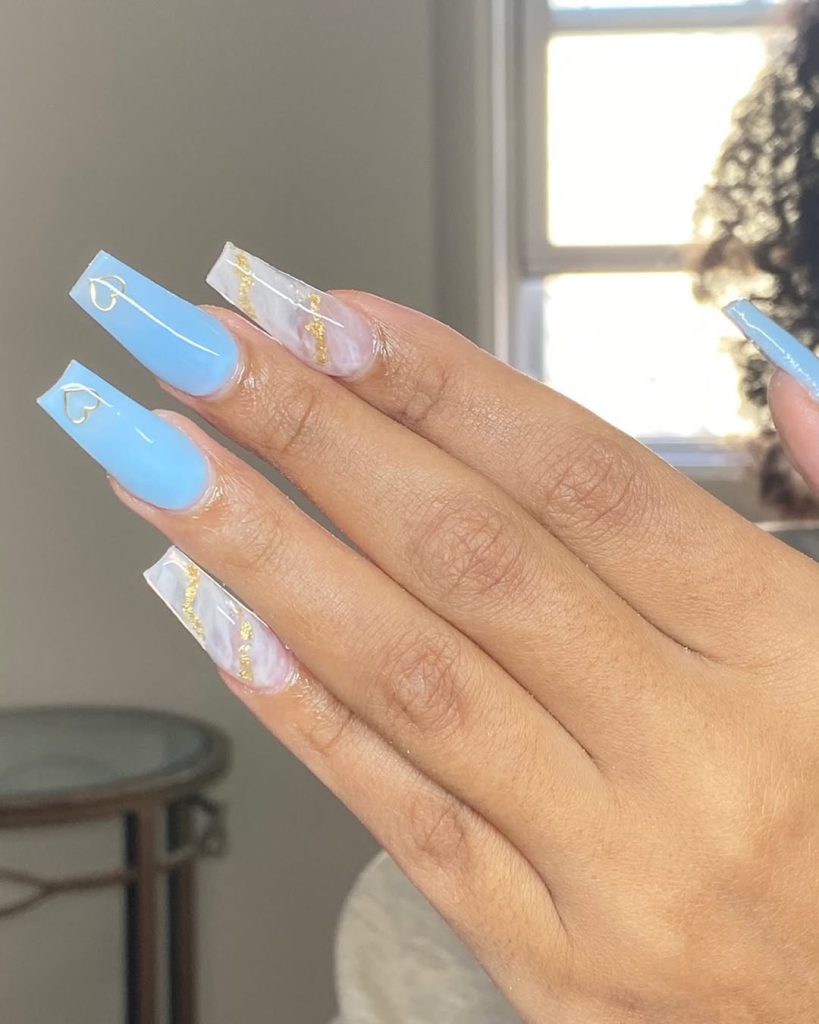 These coffin nails go hand in hand with women who enjoy long sets and they want something more creative than the basics. The blue stands out on winter neutrals and the marble and gold add a touch of luxury. Wearing black to contrast or light white knits, this style is giving immediate inspo with a self-assured touch.