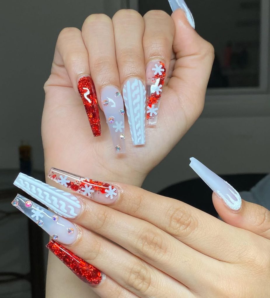 These nails are festivity in your fingertips. The bright red shimmer and icy snowflake together with knit-style patterns is festive and cool. It’s the ideal mix of frolicsome wintry inspo and glossy glamour, so these nails cannot be overlooked in the colder seasons.