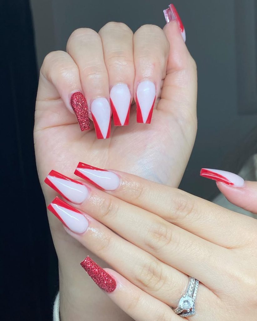 Best when it is simple and dramatic, this collection suits a medium to long nail. The fingers are longened with the red tips and the glitter accent is the adorable finishing touch. These nails can be manipulated to suit December events, whether family dinners or holiday parties, and therefore make them flexible and trendy inspo.