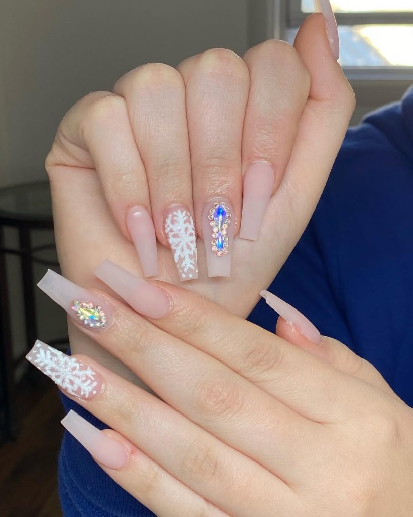 The design is winter elegance at its purest level, soft matte nude nails covered with tiny snowflakes and glittering crystals. The chilled appearance is comfortable, and the rhinestone decorations are well lit, which brings an additional touch of simplicity. It is a conservative luxury having a seasonal touch.