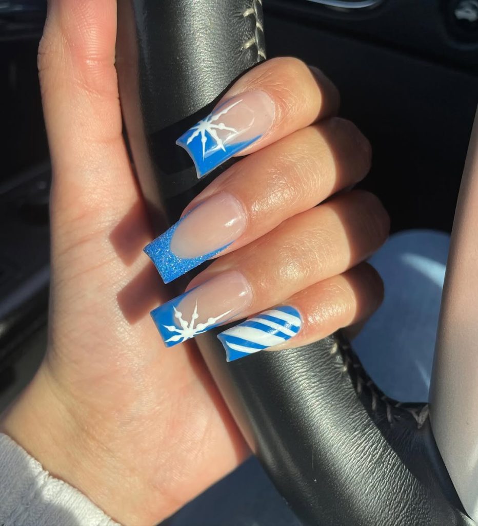 These white-washed blue coffin nails are bright and confident and they encapsulate winter as crisp. This combination of glittery and bright stripes gives a very eye-catching appearance and is sporty, fun, and energetic. It is a fresh statement design that will be fresh and not outdated in the year 2025 but still connects to seasonal inspo.