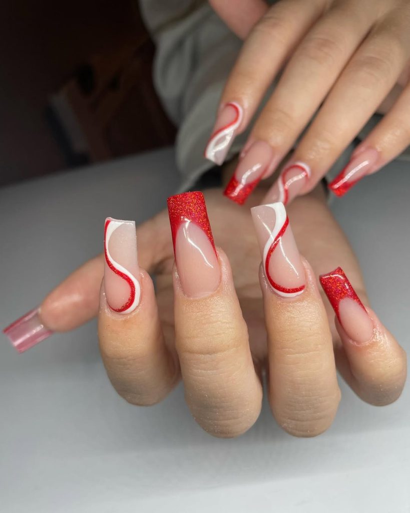 These nails sport the holiday fun with swirls of candy canes in red and white. The colours are enhanced by the sleek nude foundation and the glittering red ends generate the right level of glitziness as well. It is a style that is fun, adorable, and full of winter vibes – such as bringing a smattering of holiday magic with you.