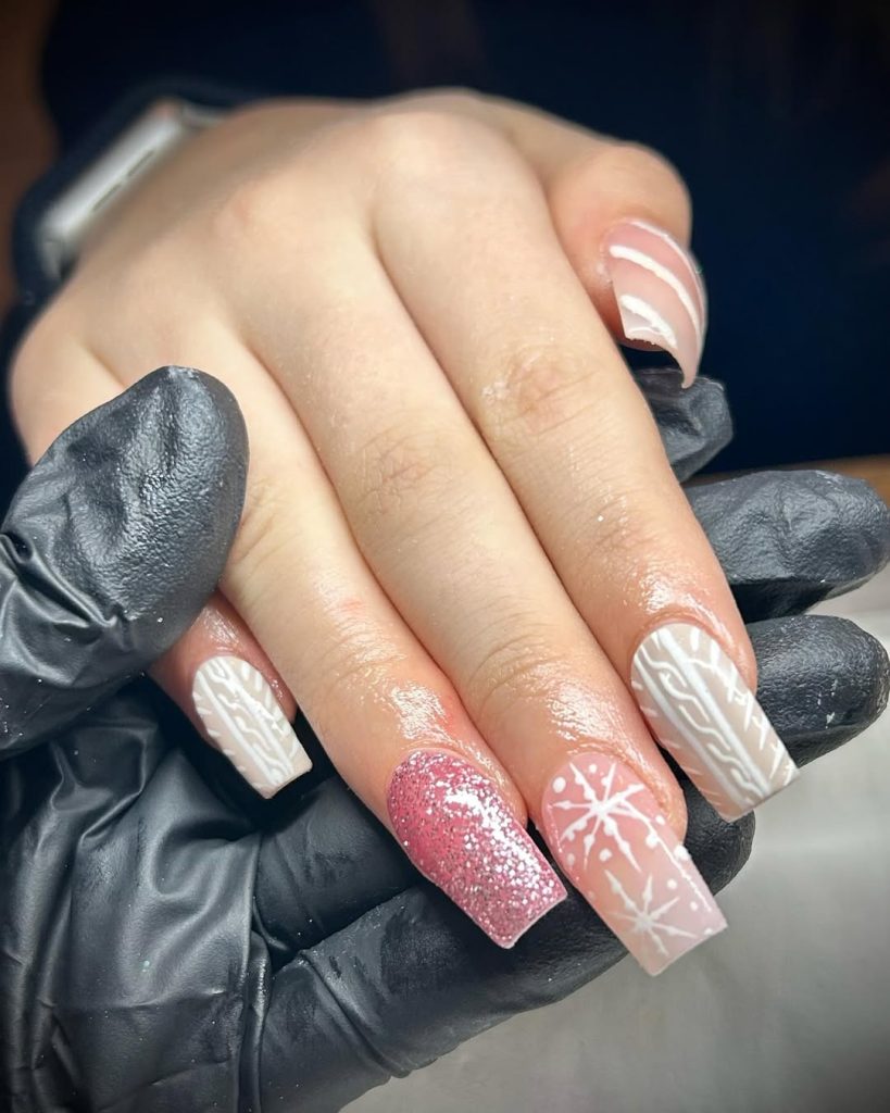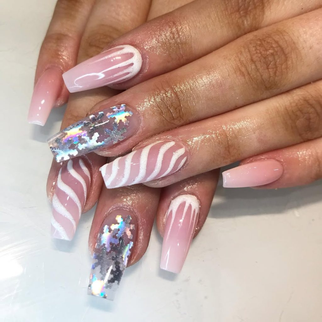 20. Pink acrylic nails with candy stripe and glitter snowflakes