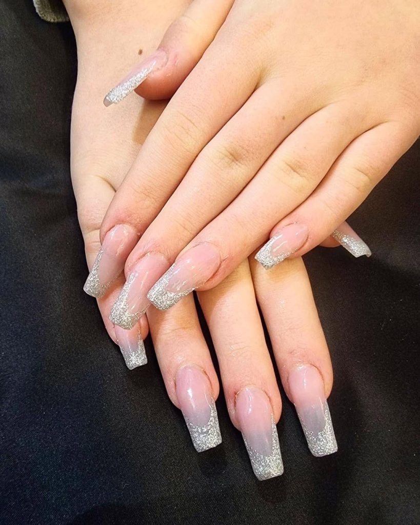 These nails are as white as fresh snow in the moon. The graded base is soft and fades into shinny silver ends, giving the look glamorous and wearable. It is easy, classy, and will suit any person who seeks classic winter designs and a touch of glitziness at the same time.