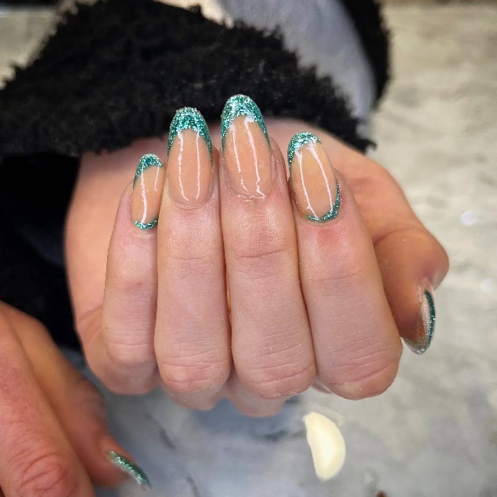 Sophisticated but not shy, these almond nails provide the right amount of pop with tips in emerald green glitter. The design is festive and yet not over the top and hits that perfect balance between cute and classy. It is a distinctive counter to the typical red or silver, so it is among the best inspo designs of winter 2025.