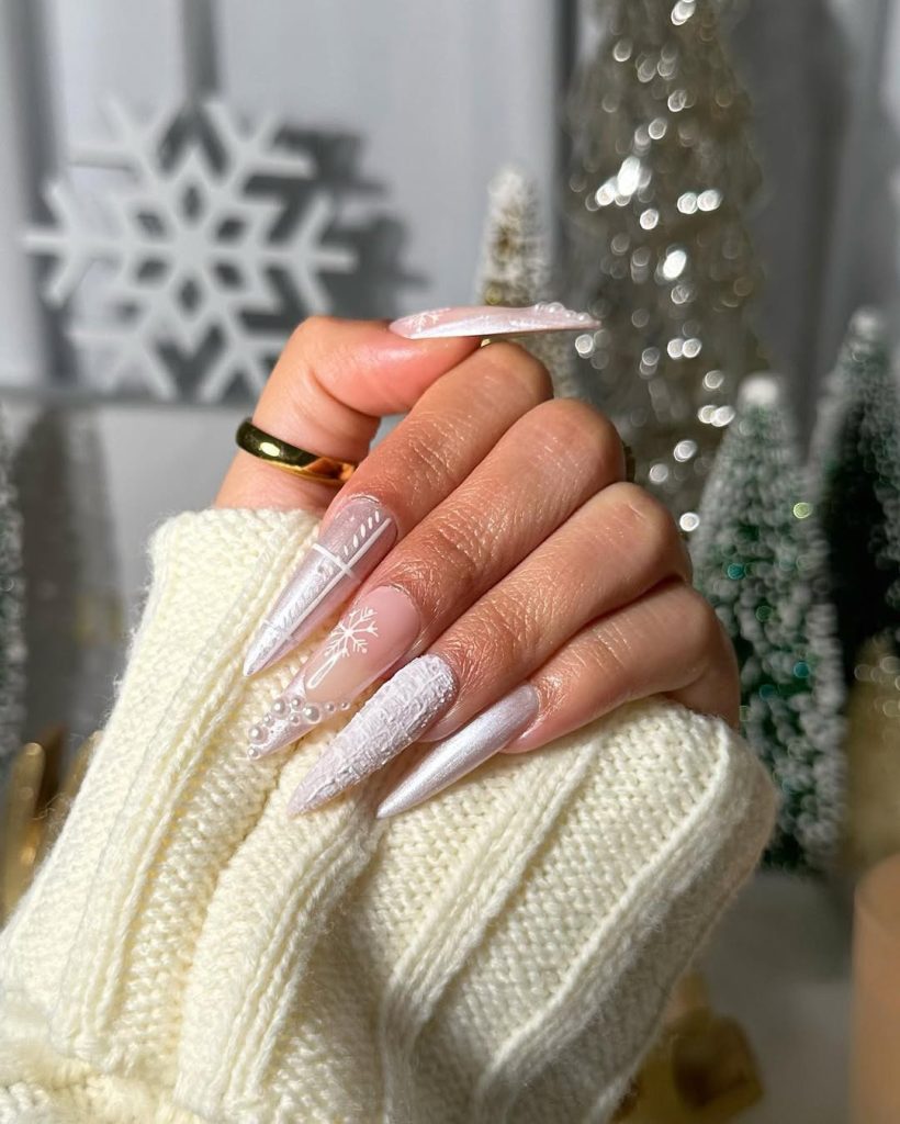 These nails are winter wonderland pure in the sense of glittering white polish, knit-textured tiny details, serene snowflake art, and also pearl decorations. The mix is opulent and classy with a frosted dreamy feel that is appropriate to the season. They are classy but not excessive and a jewelry-like design on your hands.