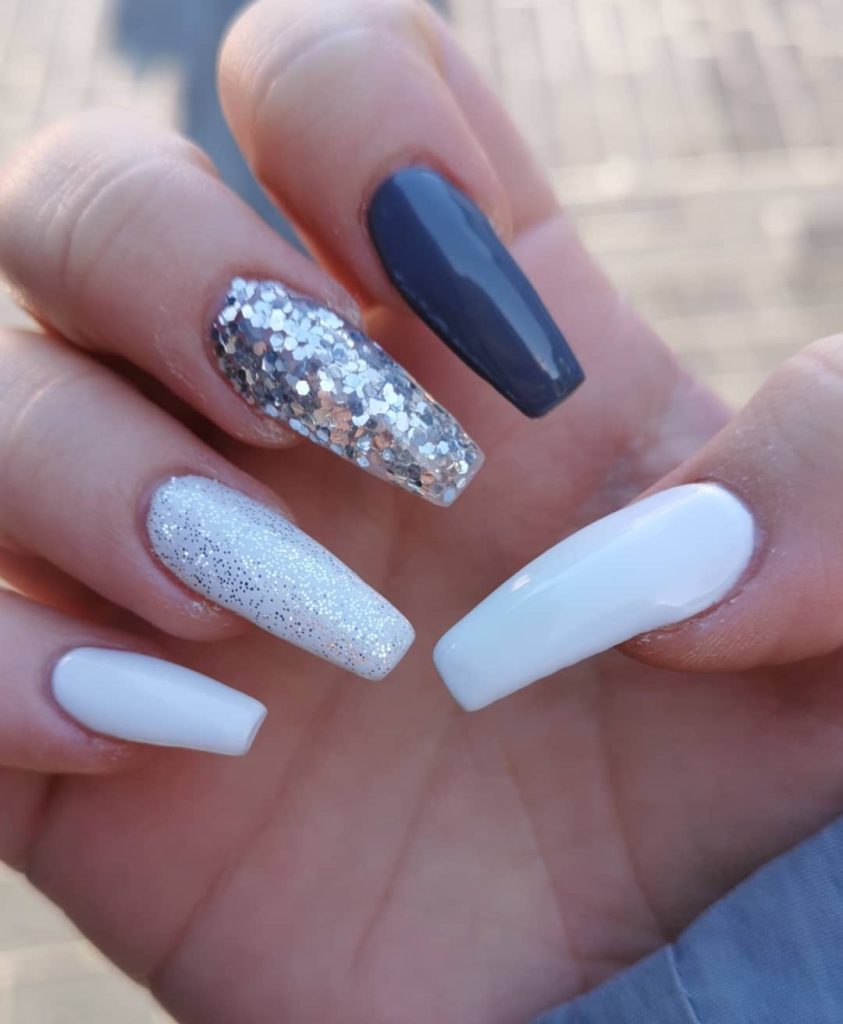 These coffin nails are a bold and modern mix of navy blue, icy white, and silver glitter layers to create an impression of power and fashion to behold. The dark and light colors contrast creates the depth and the glitter accent nails create a festive shine. It is the type of design which leaves you polished and confident with each move of your hands.