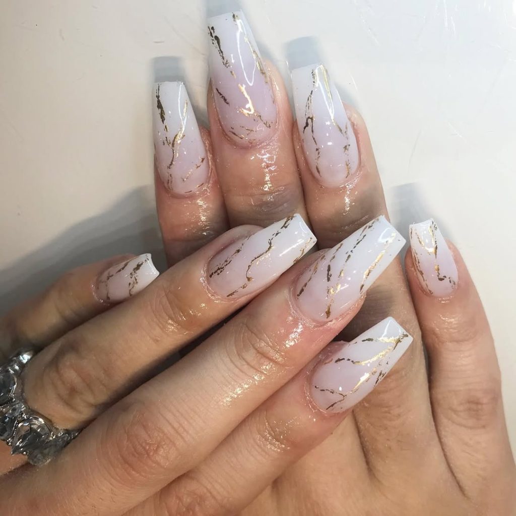 These nails put the glamour of marble into your fingertips. Delicate golden lines are applied to soft white bases giving it a feel that is luxurious and modern at the same time. It is modest enough to be worn on an everyday basis but just the right shade of glam to be used during a winter night out.