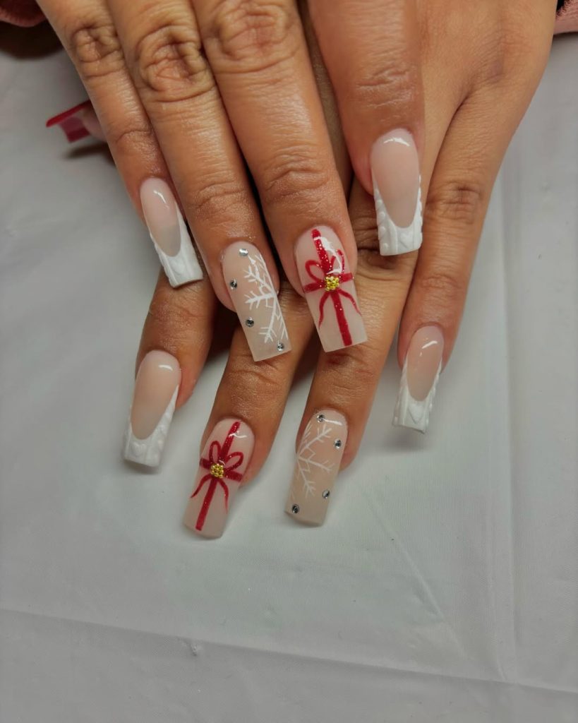 This whimsical manicure looks like it is a gift to unravel each time you see it. These nails are festive, with red ribbon art tied into bows and white snowflakes and delicate rhinestones making them personality-filled. It is a fun-loving design that evokes the holiday mood and at the same time looks trendy.
