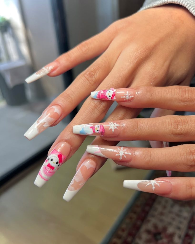 This design is fun and whimsical, with cartoon-based characters combined with snowflakes and other symbols of soft hearts. The combination of pink, blue and white colors helps them feel exclusive and younger and gives them a playful take on the traditional winter nail art. They are fierce, adorable and completely memorable.