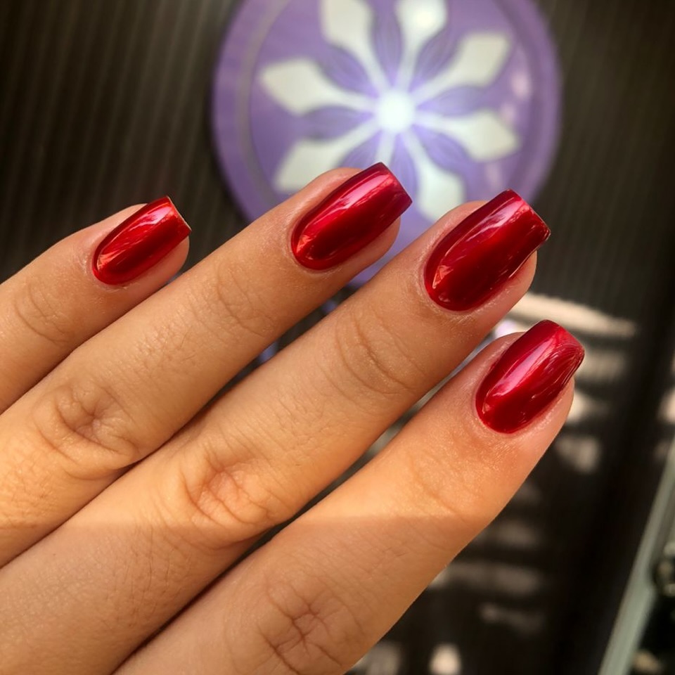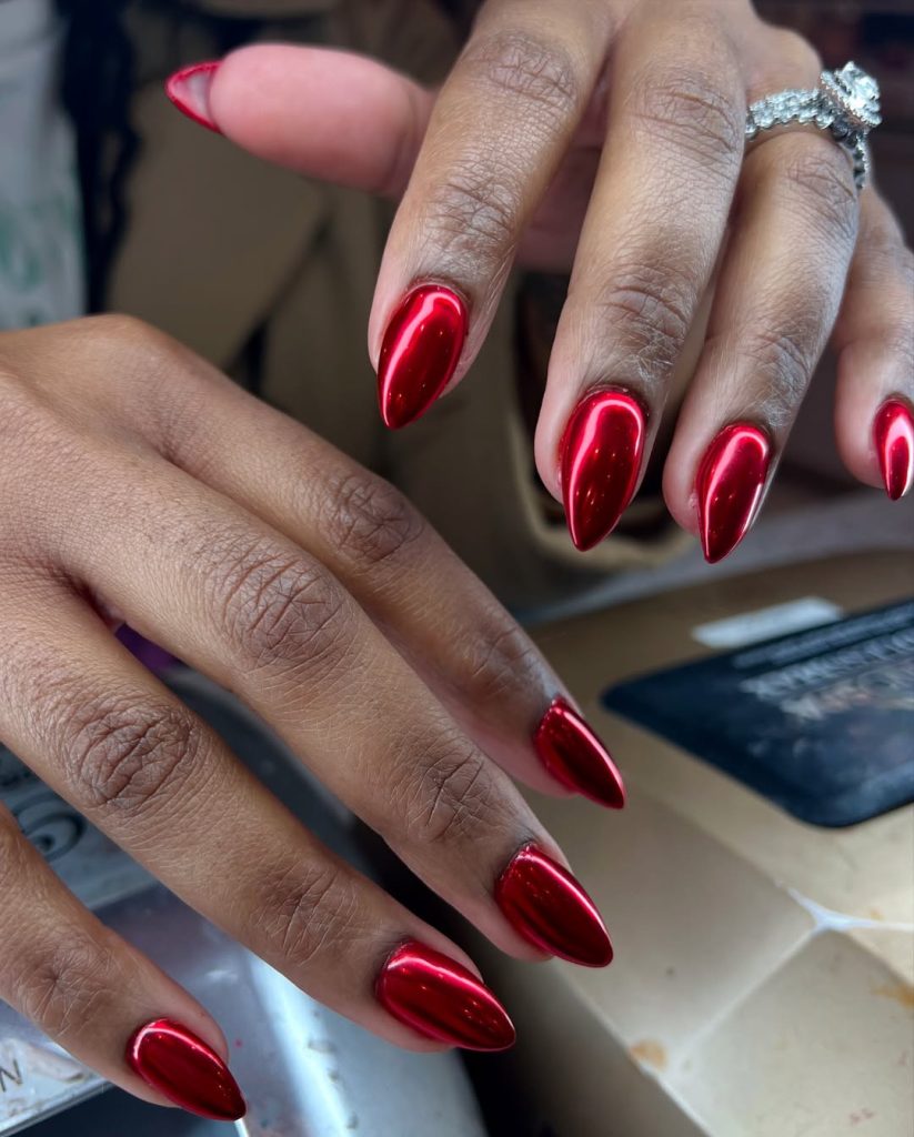 There is nothing like shiny red chrome nails that say winter confidence. They have a modern twist provided by the metallic sheen that makes them feel more like a power accessory than merely polish. This red is both celebratory and fierce, which is ideal to the holiday season or any time you want to make a statement.