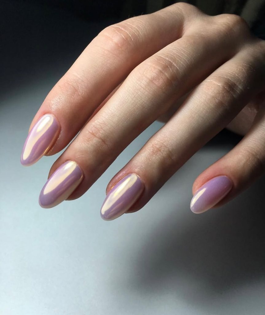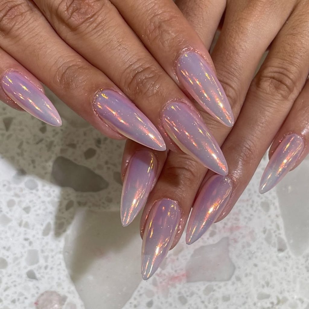 These stiletto nails are like the frozen lakes in a winter sunset–sensitive and violent. The iridescent chrome offers soft pink and light blue hues that change beautifully with each gesture and thus are a true statement look. They are dramatic yet at the same time classy, the type of nails that grabs attention immediately without uttering a single word.