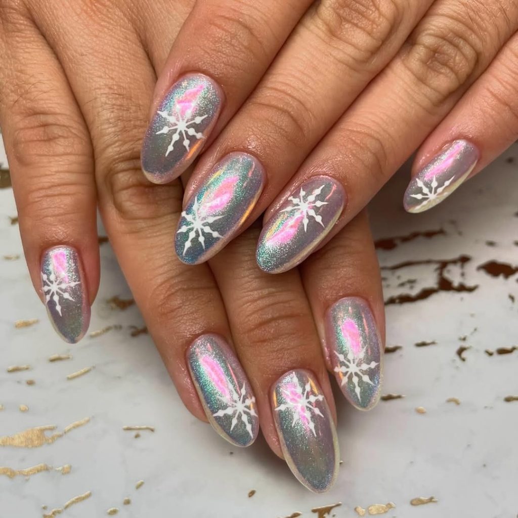 This design is best applied on the medium almond nails and allow ample space to the snowflake art to shine. Should you be in need of holiday inspiration of cute holiday ideas in 2025, this one brings a mix of minimalist chrome and beautiful detail, which makes it an excellent choice in everyday outfits as well as in the context of holiday parties.
