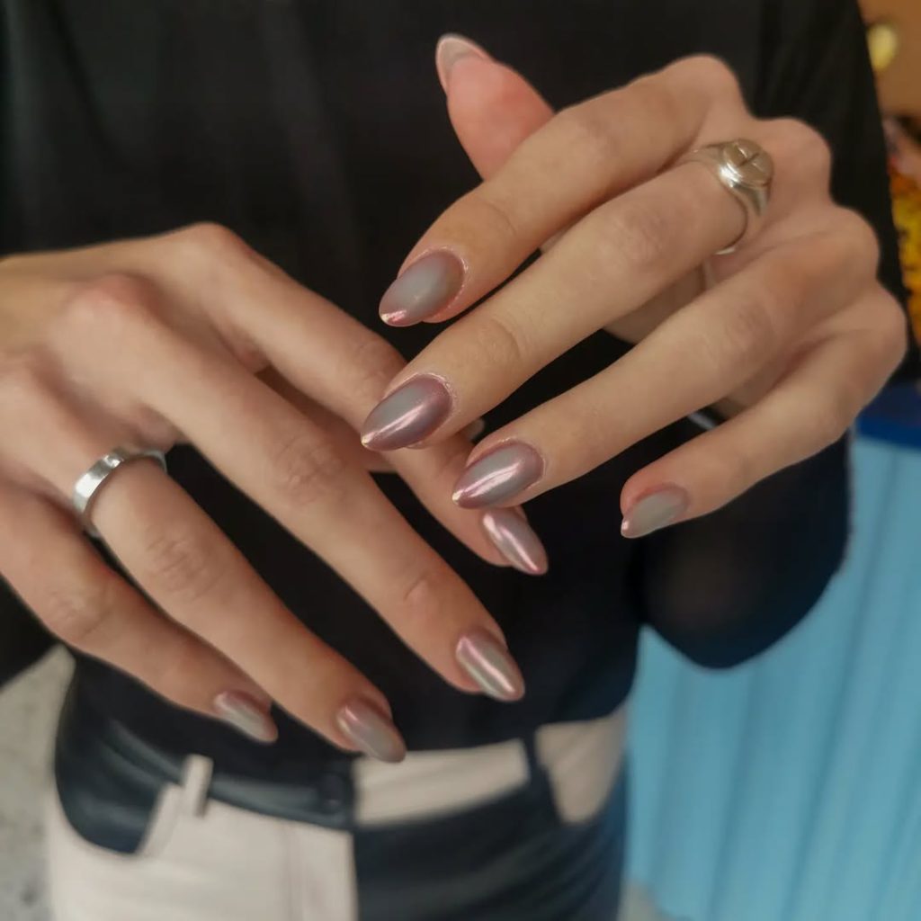 This is the best style when you desire nails to match anything, whether it is work wear or a night out. The chrome finish is ideal with almond nails and it adds length to them. Neutral designs of chrome are in trend among women who like understated styles more than bright colors in 2025.
