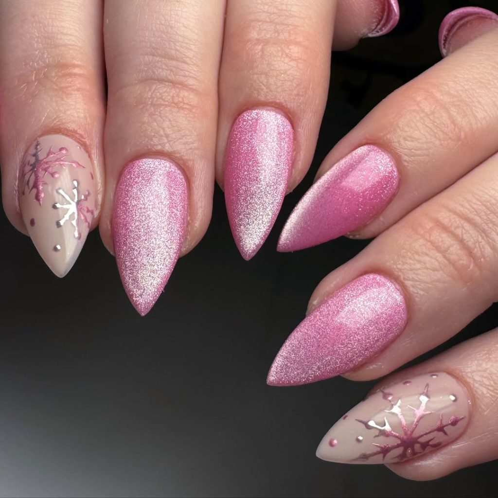 This is better suited to long almond/stiletto nails and is ideal in case you prefer more artistic detailed appearance. Especially flattering when you are seeking pink winter inspo in 2025. Combine them with warm sweaters or a holiday outfit and they will immediately burst.