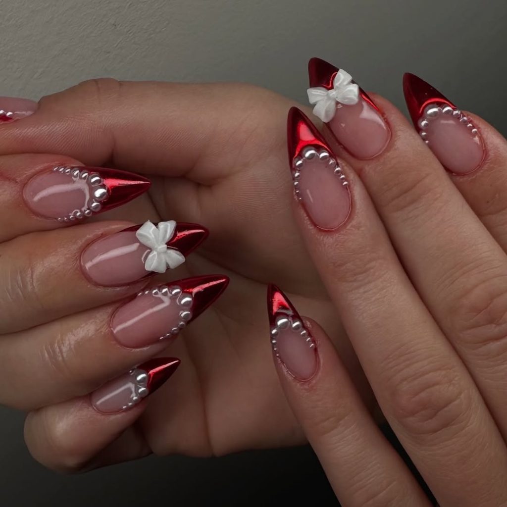 To these nails resemble small wrapped gifts, the sharp tips made of red chrome with the addition of pearls and 3D bows. They are outspoken, sporty and celebratory, the type of manicure that leaves you smiling each time you look at your hands. Great to use at a holiday party or any time you want your nails to act like an accessory all by themselves.