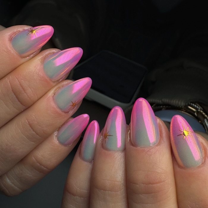 The pouring pink chrome and little golden star ornaments are dreamy and celestial, having a touch of night sky on your fingertips. The shinning pink changing into violet makes them lively and artistic and yet not too complicated.