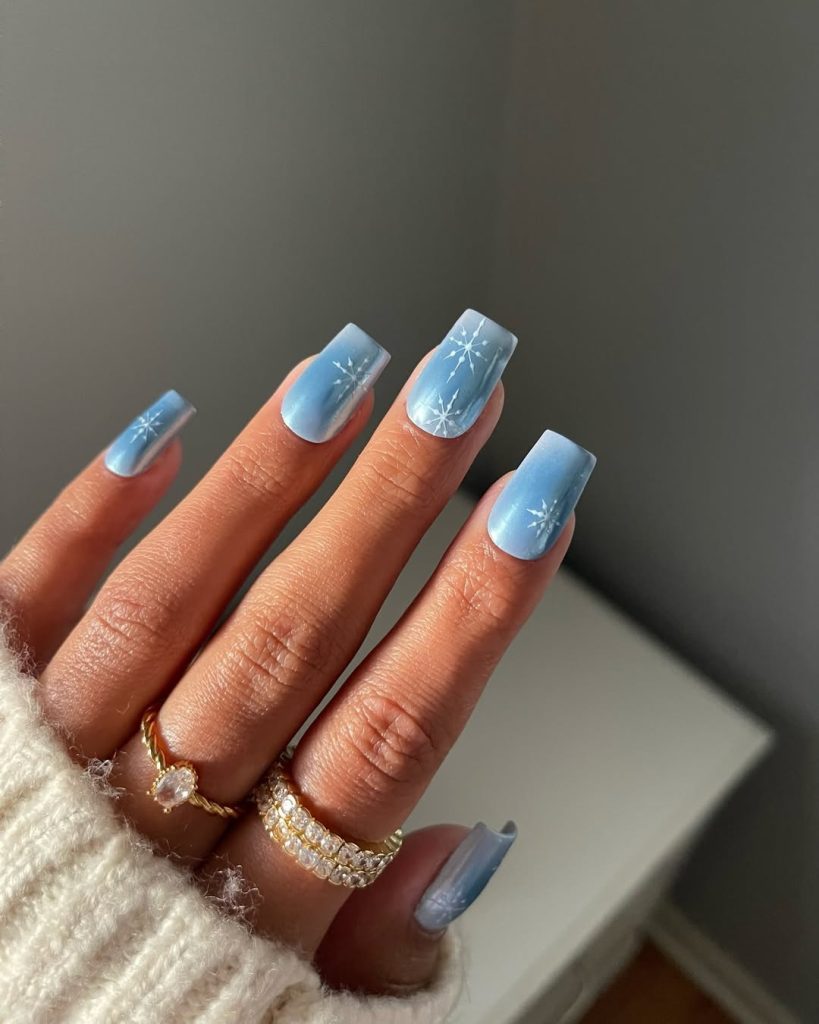 In 2026, square nails are comfortable and fashionable and provide this frosted blue with a sleek look. This shape is particularly slimming, particularly when shortened to square or medium lengths, and there is a sense of depth with the gradient effect. One that should not be missed by anyone who likes light blue winter inspo.