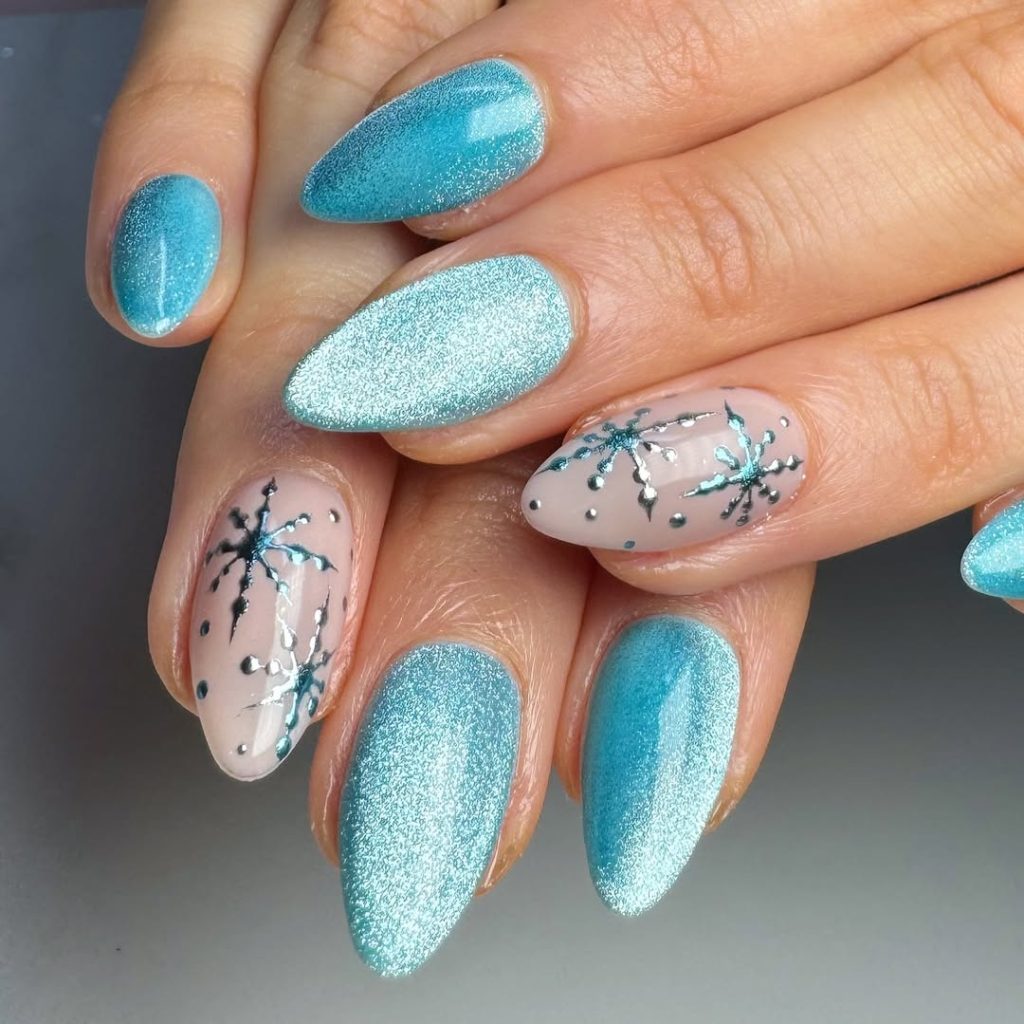 This style is ideal on medium-sized almond nails, and it allows much room to create elaborate art without becoming sloppy. Glitter and snowflake inspo is always a classic in 2025, a combination of adorable detail and seasonal sparkle, which can be used during the holidays.