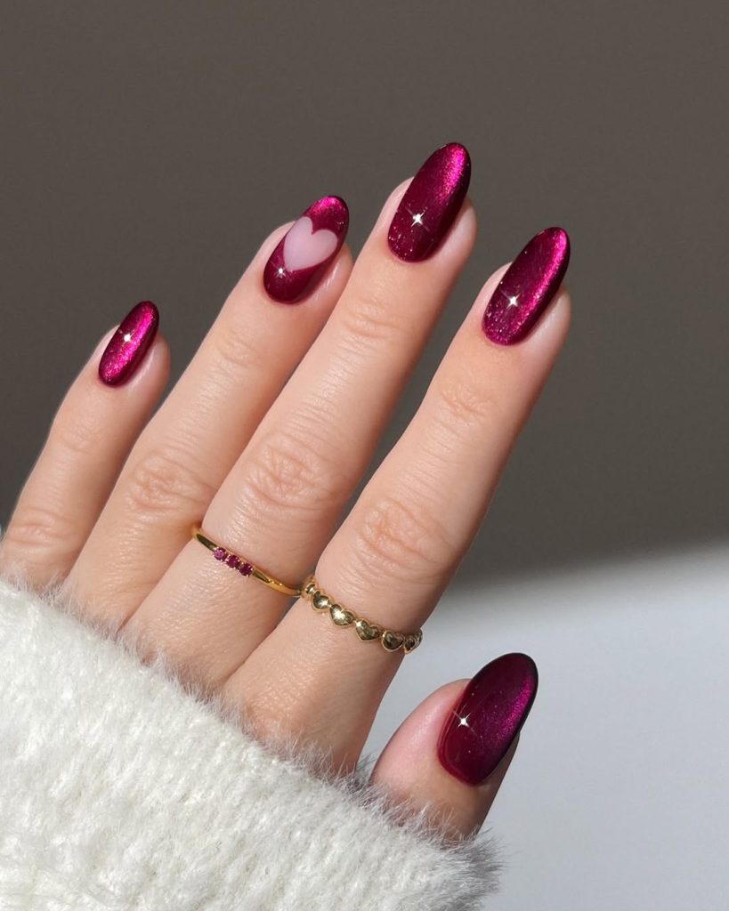 Oval nails are the best to use this look as it goes well with the glossy finish and the accent art. Berry colors are the way to go, a chic variant to red and are trending perfect in 2025 and 2026. It makes an excellent motivating design to people who appreciate a combination of a blend of bold and sweet.