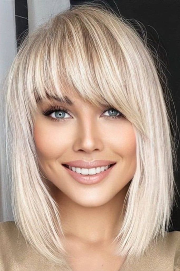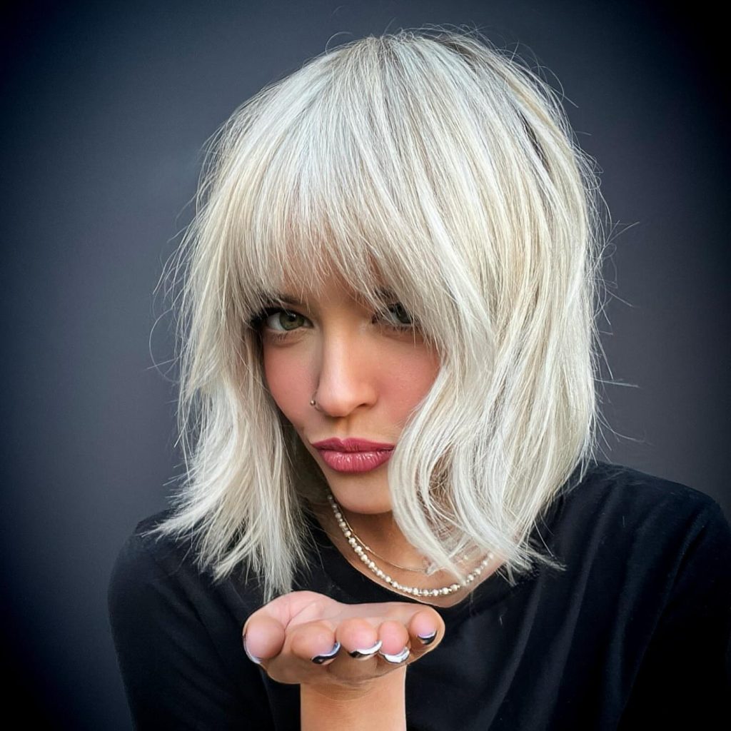 With its ash-blonde tones and delicate waves, this hairstyle feels tranquil beauty. The full bangs frame the face so well that they create a look that is both polished and gracefully effortless. It is a universal style that brings both modern business and chic night moves to perfection.