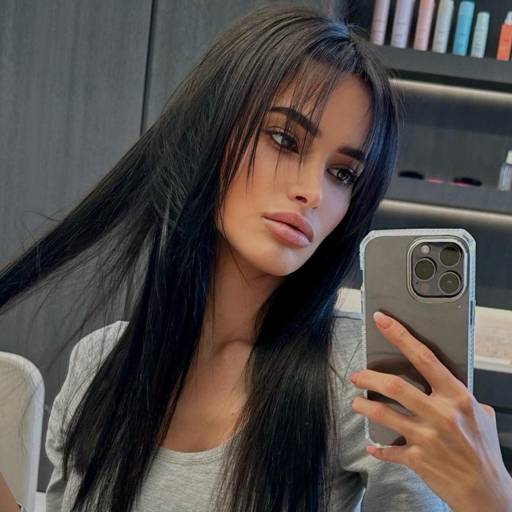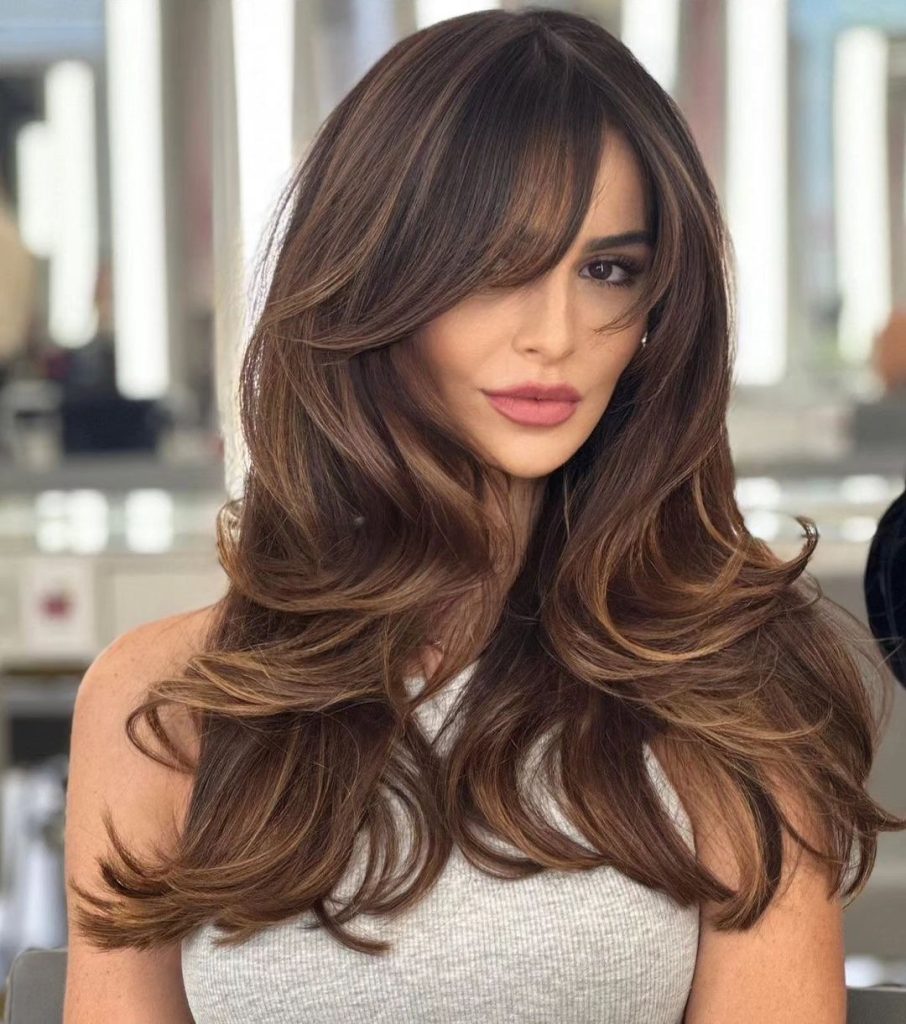The hairstyle in question is a current version of the layered hair with bangs idea, where the fringe is cut long and blended into the face-framing layers. The weave of highlights through the black base adds dimension and a sense of depth to the hair. It really represents a style that is both chic and functional, easily moving from day to night.