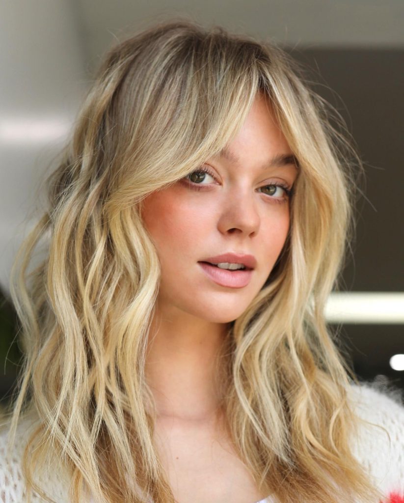 This beachy blonde hairstyle is the perfect representation of a free spirit enjoying a carefree summer day. The light, wispy bangs are the best match for the tousled, sun-kissed waves, making it the most suitable look for those who imagine ocean breeze and sandy toes. It’s a casual yet attractive combination that is easy to keep and is ideal for any informal event.
